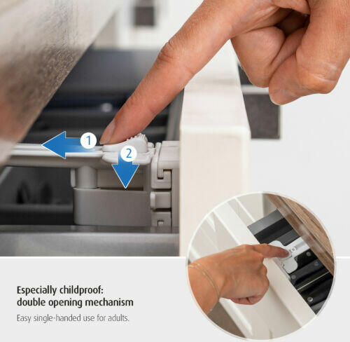 Reer fiókzár evőeszközös fiókokhoz – biztonság kis kezekre szabva (2 db) Ahogy kisbabád egyre ügyesebben kúszik, mászik, végül járni kezd, a lakás minden zugát felfedezné – így a fiókokat is. Ezek azonban gyakran éles tárgyakat, például késeket, ollókat, vagy gyógyszereket rejtenek. A Reer evőeszközös fiókzár segít abban, hogy ezek a veszélyes tárgyak elérhetetlenek maradjanak gyermeked számára, miközben megakadályozza az ujjak becsípődését is. A biztonsági zár intelligens kialakításának köszönhetően a fiók csak egy résnyire nyitható, amíg a retesz be nem akad. Ebben a pozícióban a fiók nem nyitható vagy csukható teljesen, így a gyermek nem fér hozzá a tartalmához, és ujjait sem csípheti oda. A felnőttek számára a fiók egy kézzel is könnyedén nyitható a kétlépcsős biztonsági mechanizmus segítségével. A zár diszkréten, belülre kerül felszerelésre, így kívülről nem látható, és nem hagy nyomot a bútoron. Használható sekély fiókokhoz is (pl. evőeszköztartós), valamint túlnyúló munkalapokkal rendelkező bútorokhoz (max. 20 mm). A felszerelés ragasztással vagy csavarozással is történhet, az installációs segédletnek köszönhetően mérés vagy jelölés nélkül. A Reer fiókzár megfelel az EN 16948:2017 szabványnak, 5000+ nyitás-zárás után is megbízható, nem reped, nem törik – tartós és biztonságos választás.